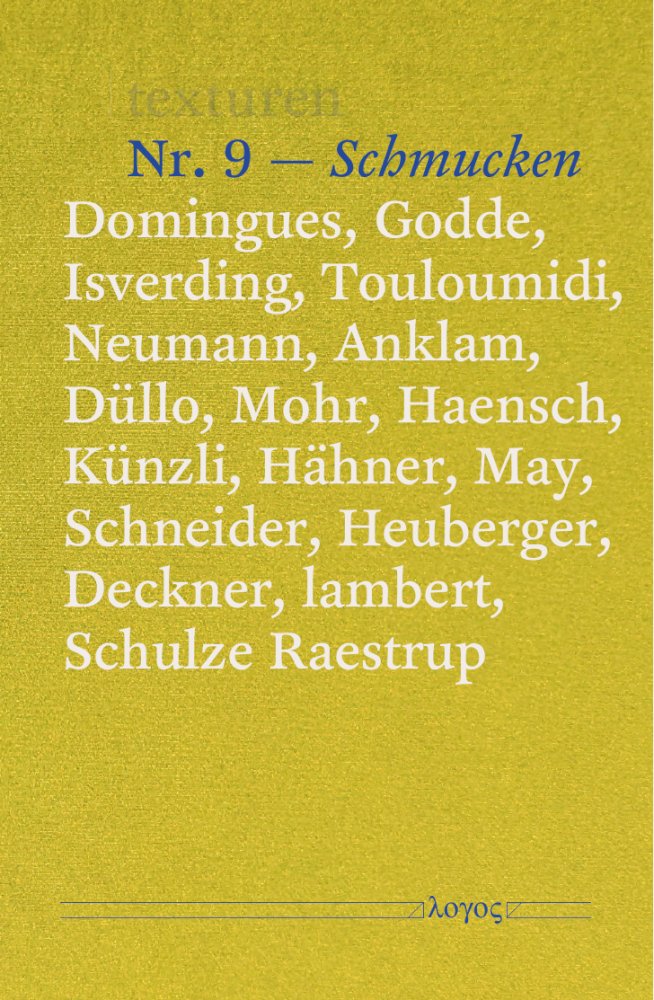 Die Nähe zu einem Menschen, die einem Schmuckobjekt immanent ist, besteht darin, sich an den Körper zu wenden. Getragener Schmuck assoziiert mit persönlichen sowie sozialen Vorstellungen, Werten und Gefühlen. Er verwandelt sich in ein Medium individuellen und gesellschaftlichen Ausdrucks. Das gefundene oder geschenkte Objekt in der Tasche wird von der Hand gesucht und ertastet, um durch diese Berührung Halt zu finden. Auf der Haut platzierte Objekte hinterlassen einen taktilen Reiz und sind erfahrungs- und erinnerungsträchtig. Objekte auf der Kleidung signalisieren, dass sie etwas über ihre materielle Form aussagen möchten und Angebote zu Narrationen machen wollen. Schmucken trägt dazu bei, Identitäten und Erzählungen zu beherbergen und Botschaften freizusetzen. Auch ganz ohne Körpernähe, ungetragen. Schmucken meint also nicht nur: etwas oder sich schmücken, sondern schmuckartig sein, schmuck werden – als Attribut und Haltung. Auch als Artefakt. Als schmuck werden von Objekten, von Städten, von Habitaten und mehr. Diesem Schmuck-Werden gehen die Texturen Nr. 9 nach. Wenn es Bling macht, und nicht Glitzer. Wenn Schmuck zu Protest wird. Wenn Schmuck unmögliche Kombinationen wagt, wenn Schweifhaare und Hufhorn sich schmuckartig artikulieren. Und wie damit Schmuckforschende heute den Diskurs führen. Mittels genauer Reportagen, theoriefreudiger Essays, fotografischer Beobachtungen.