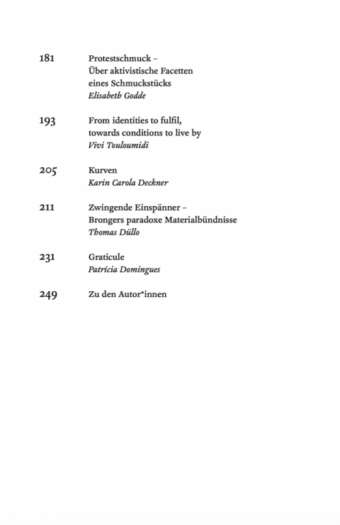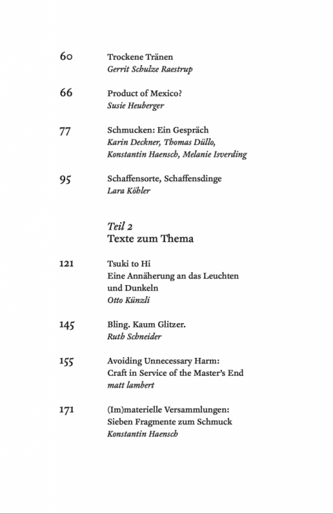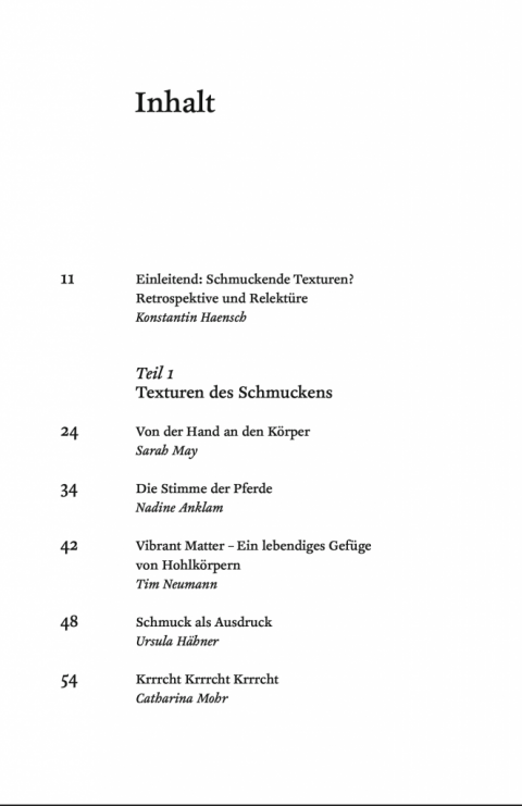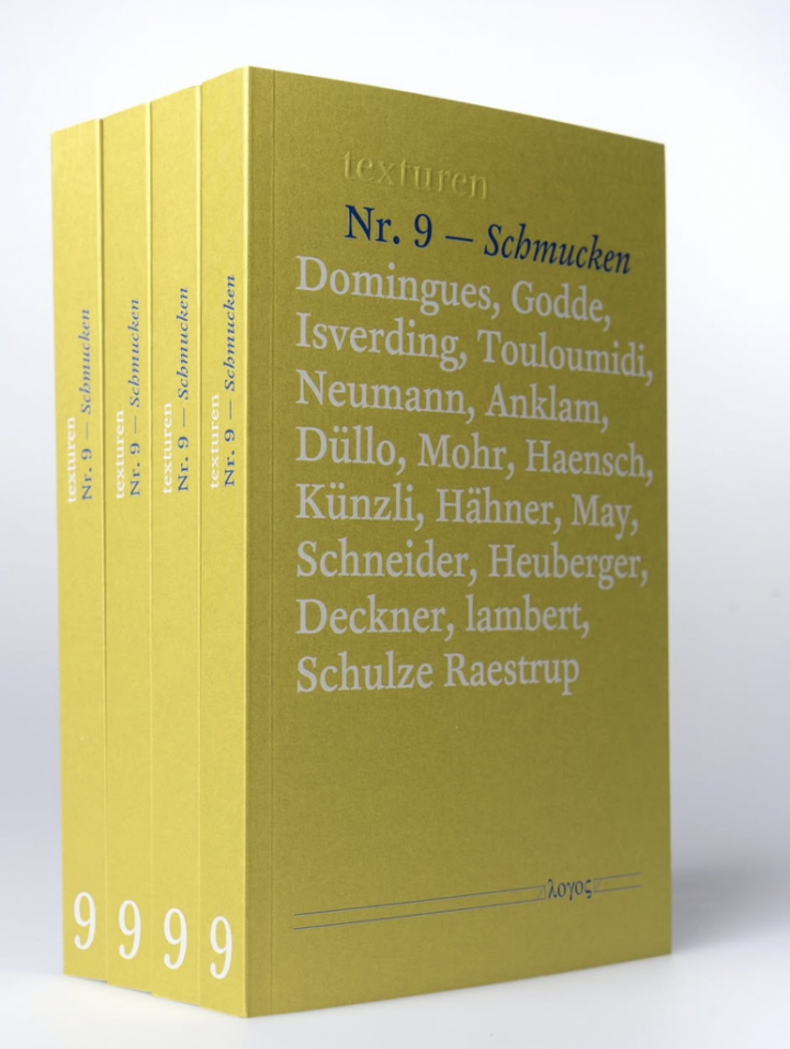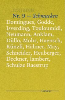Die Nähe zu einem Menschen, die einem Schmuckobjekt immanent ist, besteht darin, sich an den Körper zu wenden. Getragener Schmuck assoziiert mit persönlichen sowie sozialen Vorstellungen, Werten und Gefühlen. Er verwandelt sich in ein Medium individuellen und gesellschaftlichen Ausdrucks. Das gefundene oder geschenkte Objekt in der Tasche wird von der Hand gesucht und ertastet, um durch diese Berührung Halt zu finden. Auf der Haut platzierte Objekte hinterlassen einen taktilen Reiz und sind erfahrungs- und erinnerungsträchtig. Objekte auf der Kleidung signalisieren, dass sie etwas über ihre materielle Form aussagen möchten und Angebote zu Narrationen machen wollen. Schmucken trägt dazu bei, Identitäten und Erzählungen zu beherbergen und Botschaften freizusetzen. Auch ganz ohne Körpernähe, ungetragen. Schmucken meint also nicht nur: etwas oder sich schmücken, sondern schmuckartig sein, schmuck werden – als Attribut und Haltung. Auch als Artefakt. Als schmuck werden von Objekten, von Städten, von Habitaten und mehr. Diesem Schmuck-Werden gehen die Texturen Nr. 9 nach. Wenn es Bling macht, und nicht Glitzer. Wenn Schmuck zu Protest wird. Wenn Schmuck unmögliche Kombinationen wagt, wenn Schweifhaare und Hufhorn sich schmuckartig artikulieren. Und wie damit Schmuckforschende heute den Diskurs führen. Mittels genauer Reportagen, theoriefreudiger Essays, fotografischer Beobachtungen.